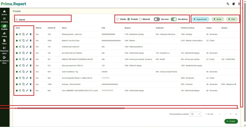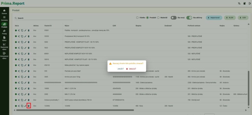 • XLSX  a  CSV – týmto tlačidlom je možné exportovať vybraný zoznam produktov alebo materiálov  vo formáte XLSX (Excel) alebo  vo formáte CSV na ďalšie spracovanie v centrálnom systéme výrobcu.
