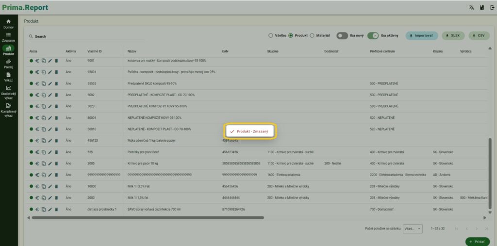Aplikácia ďalej rozlišuje produkty alebo materiály, ktoré sú AKTÍVNE, tzn. že sa stále predávajú, alebo NEAKTÍVNE, ktoré sú vyradené z predaja.