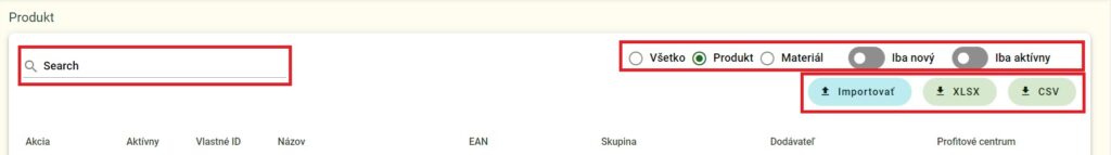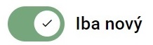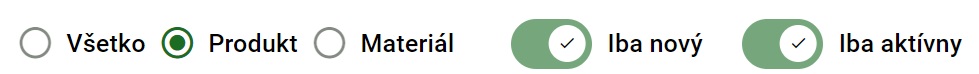 Užívateľ môže aktívne ovplyvniť zobrazenie zoznamu iba nových produktov alebo materiálov zapnutím prepínača  „Iba nový“ (prepnutie zo šedej na zelenú farbu).