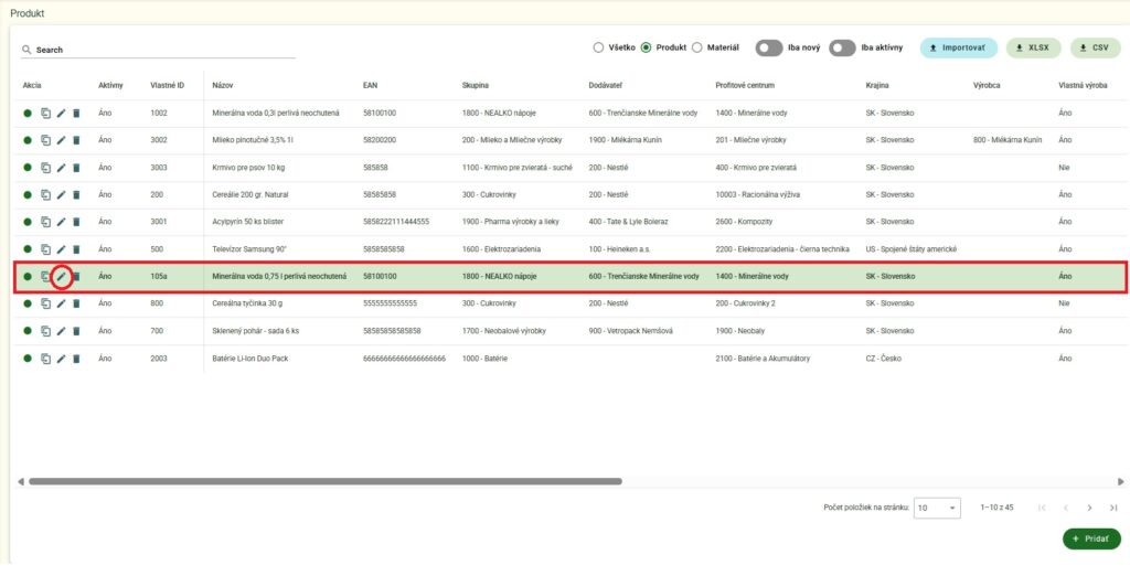 Pre pokračovanie v práci je potrebné kliknúť ľavým tlačidlom myši kamkoľvek na pracovnú plochu, čim oznámenie o úprave produktu zmizne a sprístupnia sa všetky záznamy databázy produktov/materiálov.