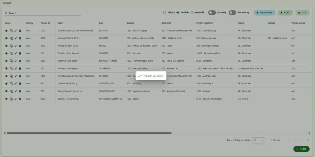 Následne sa aplikácia vráti na zoznam produktov a v strede obrazovky sa zobrazí oznam, že bol Produkt upravený.