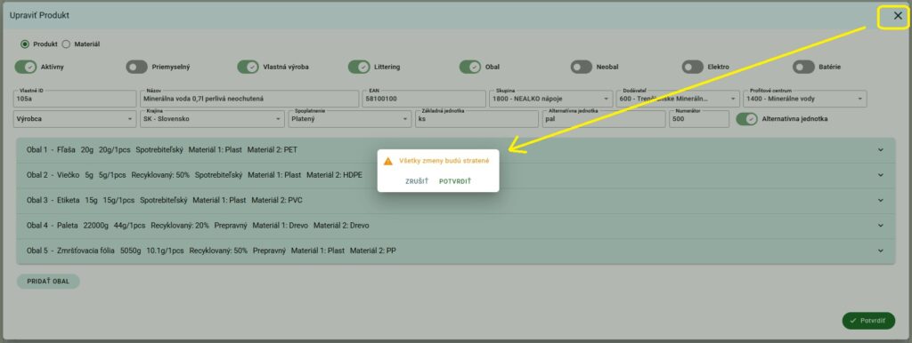Pokiaľ chce užívateľ vykonané úpravy záznamu uložiť, je potrebné najprv stlačiť tlačidlo ZRUŠIŤ priamo v okne upozornenia na možnú stratu údajov, a následne stlačiť tlačidlo POTVRDIŤ vpravo dole pod rozbaleným záznamom produktu.