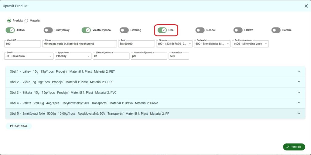 V hornej časti formulára budú zobrazené základné informácie o produkte a pod nimi bude zobrazený zoznam obalov, ktoré sa používajú pri balení vybraného produktu, pokiaľ už boli obaly k tomuto produktu zadané.