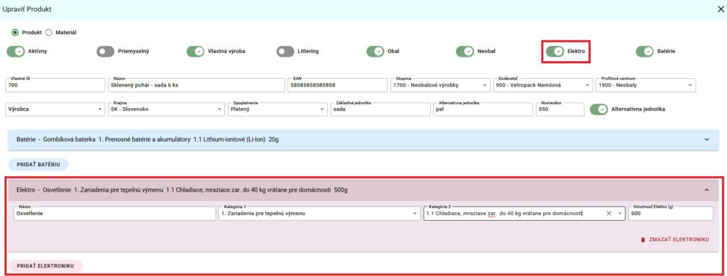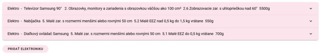 Pokiaľ má produkt viacero prvkov, resp. súčastí elektrozariadení, vľavo dole je potrebné stlačiť tlačidlo PRIDAŤ ELEKTRONIKU.