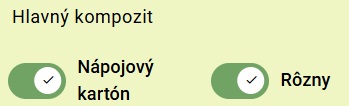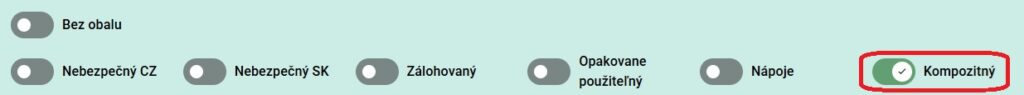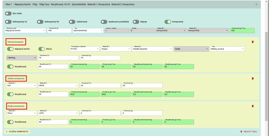 prepnutím tohto prepínača na aktívny (zelený) aplikácia automaticky sprístupní pole pre zadanie  % podielu recyklovaného obalu a aplikácia automaticky vypočíta podiel primárnej zložky a recyklovanej zložky príslušnej vrstvy kompozitného obalu v gramoch na jednu obalovú vrstvu a v gramoch na 1 kus produktu.