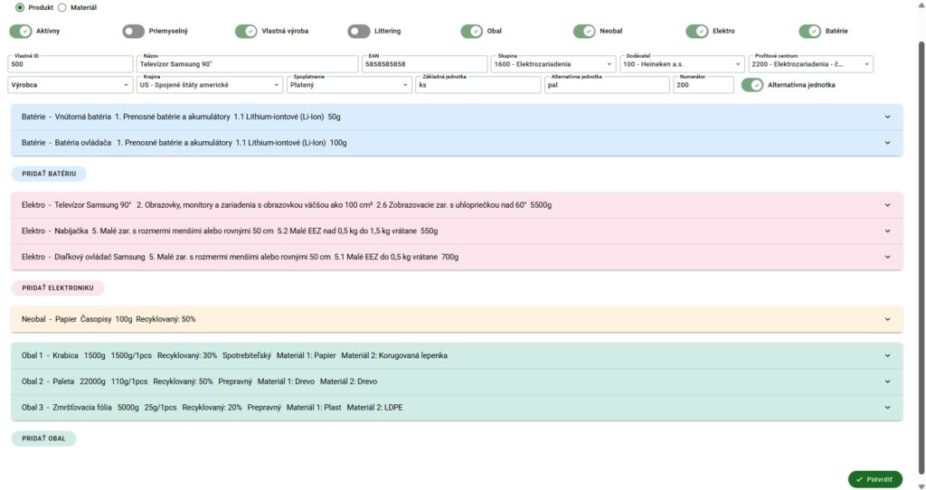 Pokiaľ budú tvoriť súčasť produktu obaly, neobalový výrobok, elektrozariadenia, a batérie a akumulátory, je možné v riadku prepínačov produktu zakliknúť všetky typy produktov súčasne.