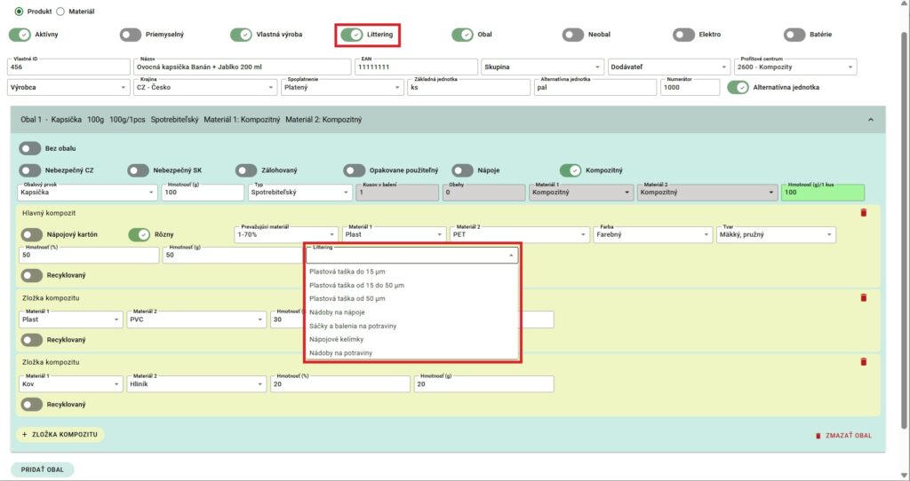 Pokiaľ užívateľ vo formulári produktu zapol prepínač LITTERING, pri zadávaní povinných údajov vo formulári obalu sa sprístupní okno prístupných možností pre Littering, v ktorom si užívateľ vyberie jednu z ponuky prípustných možností.