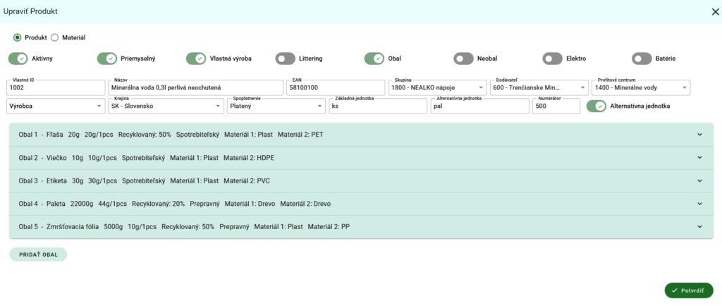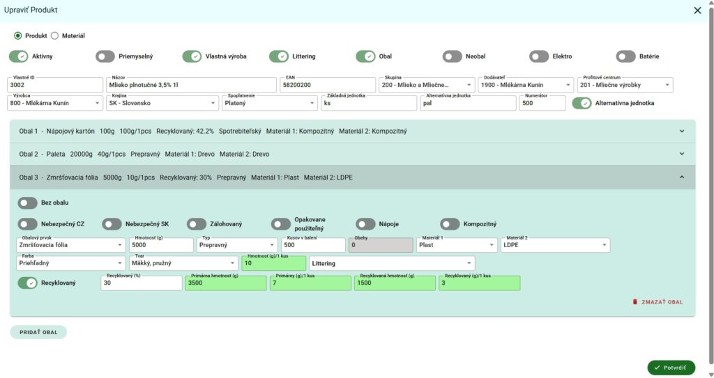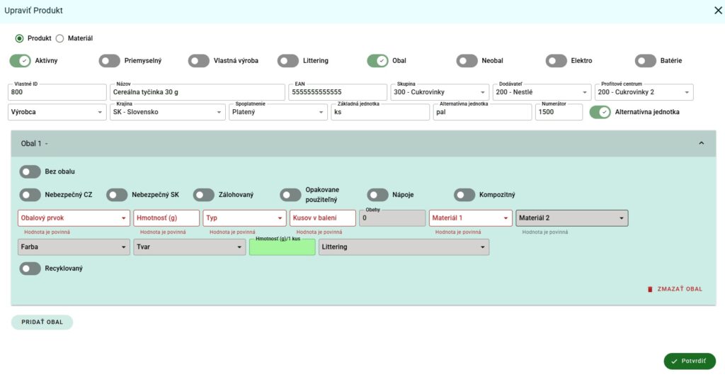 • Nebezpečný SK – zapnutím tohto prepínača sa obal produktu bude vykazovať v príslušnej sekcii výkazu určeného pre SR v súlade s aktuálnou legislatívou.