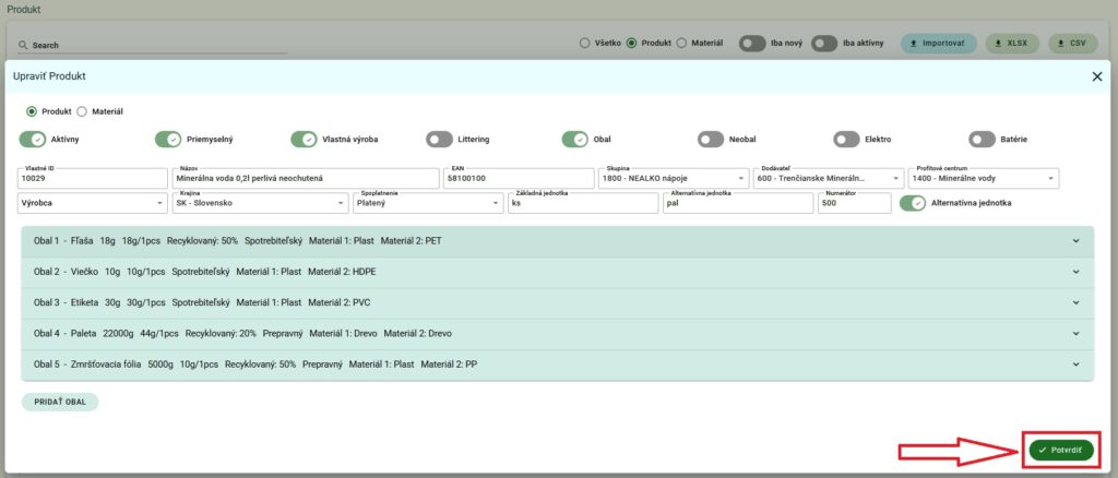 Užívateľ ukončí zadávanie obalových zložiek, stlačením tlačidla Potvrdiť vpravo dole pod zoznamom obalov produktu.