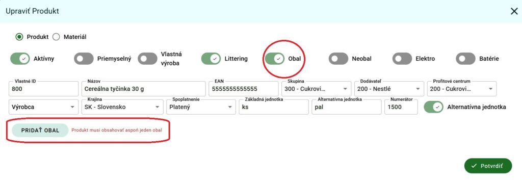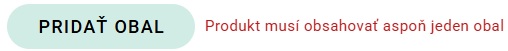 Vedľa tlačidla PRIDAŤ OBAL sa zobrazí aj upozornenie, že je pre produkt potrebné zadať aspoň jeden obal.