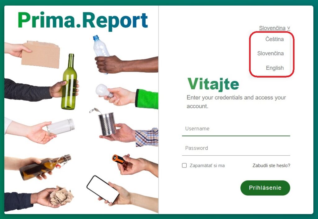 Na začiatku práce s aplikáciou si v hornom menu uvítacej obrazovky zvoľte jazyk, v ktorom si prajete komunikovať s aplikáciou PRIMA REPORT (ďalej aj ako „aplikácia“).