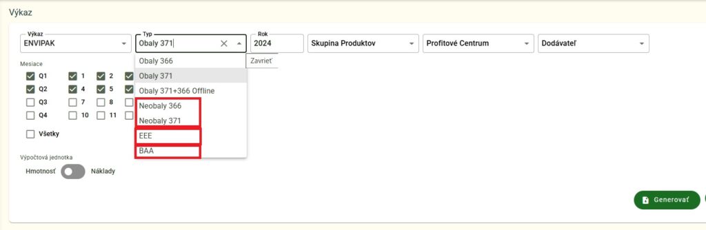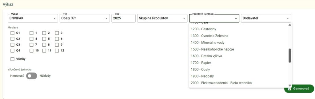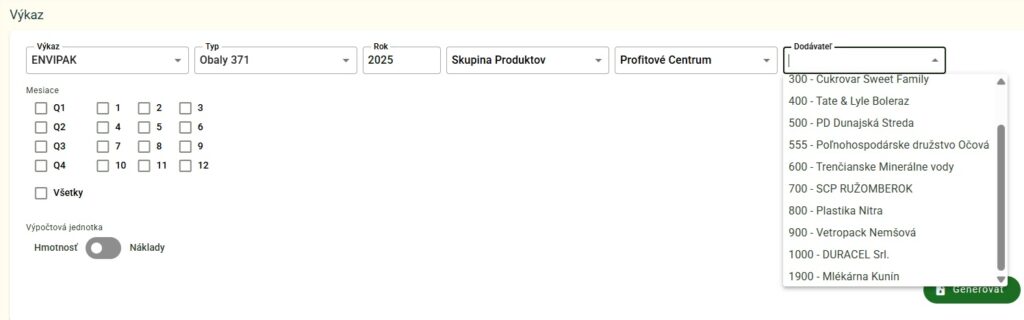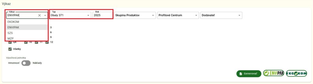 Mierne odlišný výkaz má OZV ENVIPAK, preto nájdete vo výberovom okne Výkaz možnosť generovania výkazov pre túto OZV.
