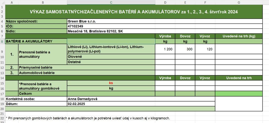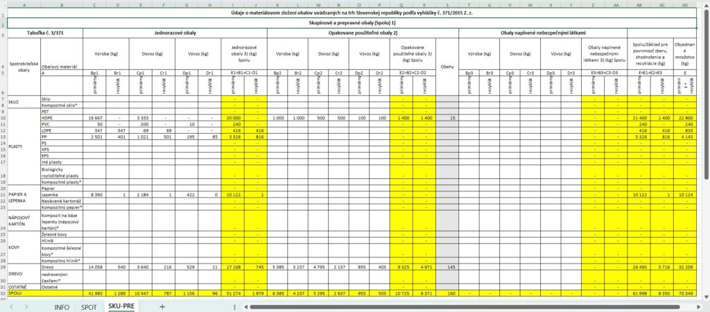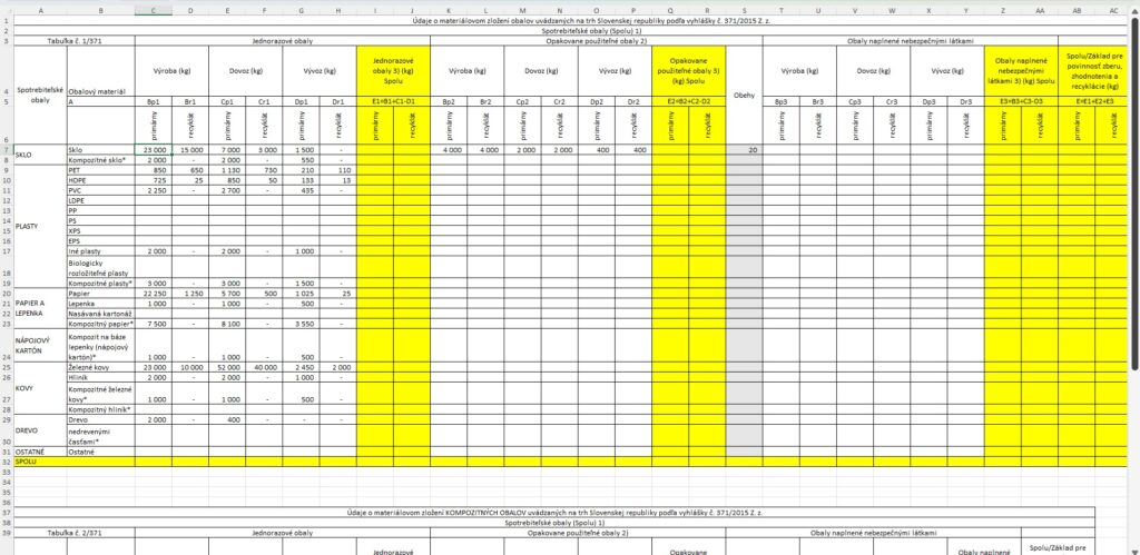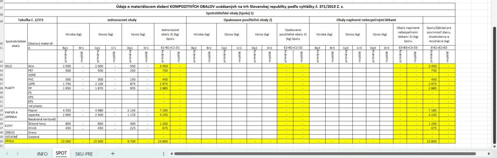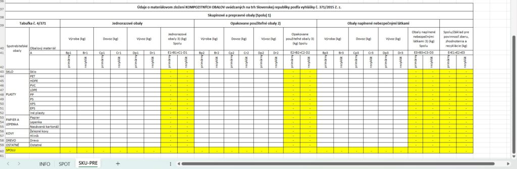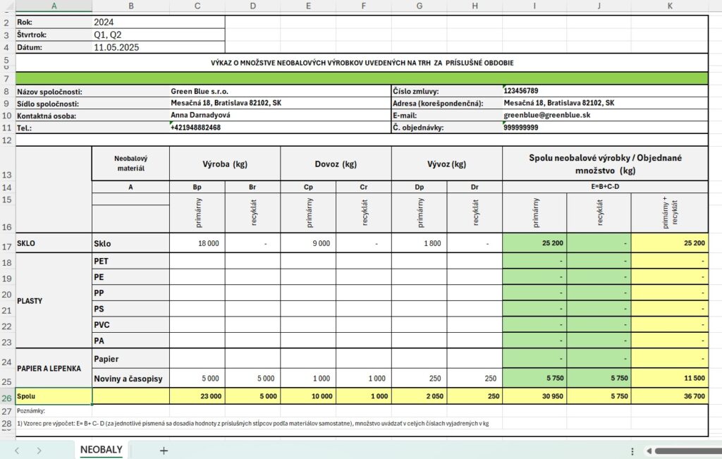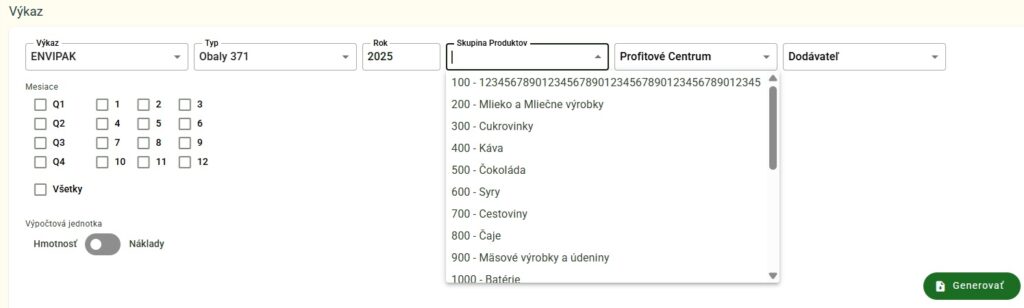 Pre vytvorenie výkazu pre OZV ENVI-PAK je potrebné zadať nasledovné povinné údaje: