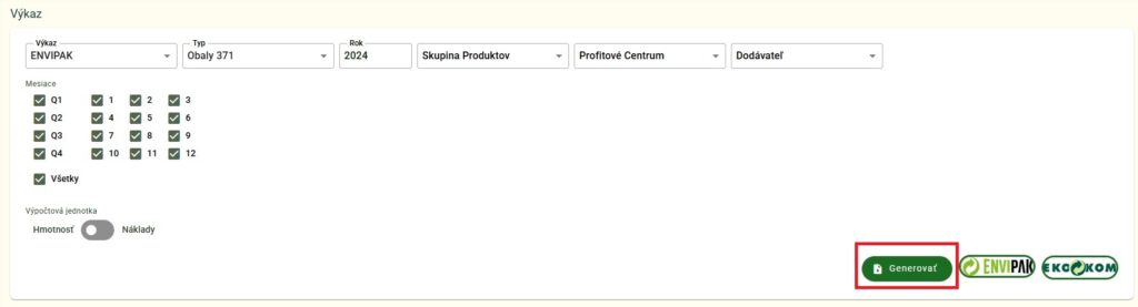 Po zadaní všetkých požadovaných parametrov sa výkaz vygeneruje veľmi jednoducho, a to stlačením tlačidla Generovať, ktoré sa nachádza na obrazovke vpravo dole.