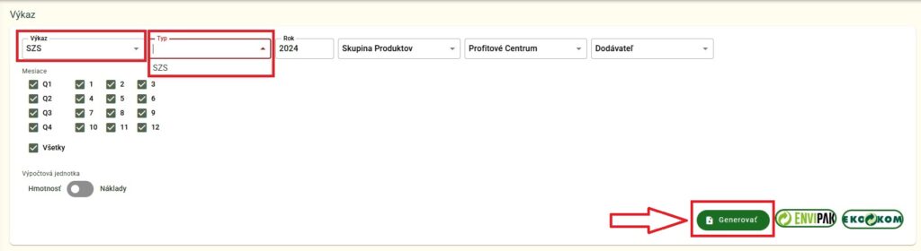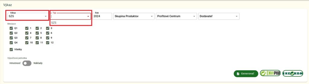 Posledným krokom je generovanie vybraného výkazu. Vygeneruje sa výkaz, ktorý výrobca vykazuje SZS podľa požiadaviek stanovených SZS.